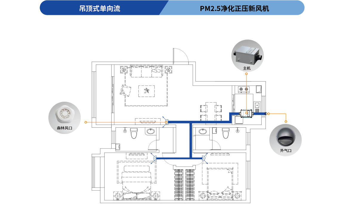方案说明:主机放置在厨房吊顶内,在每个房间及客厅布置送风口,通过不断向室内送入洁净新鲜空气,让室内形成微正压环境,从而防止污浊气体进入室内,让整个室内时刻保持良好的空气环境。
