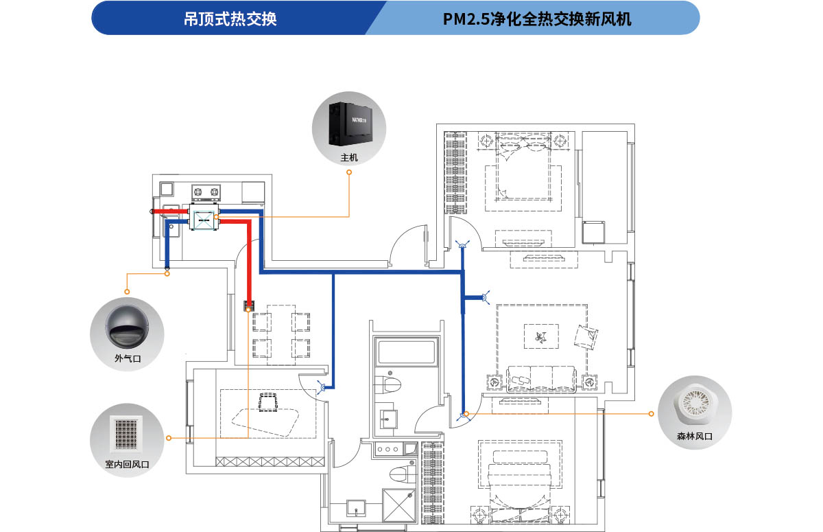 方案优势:主机采用高效电机,分控技术,送排风可单独控制。采用合理风腔结构,高风压、低噪音。PM2.5过滤效率>95%,滤网更换便捷。